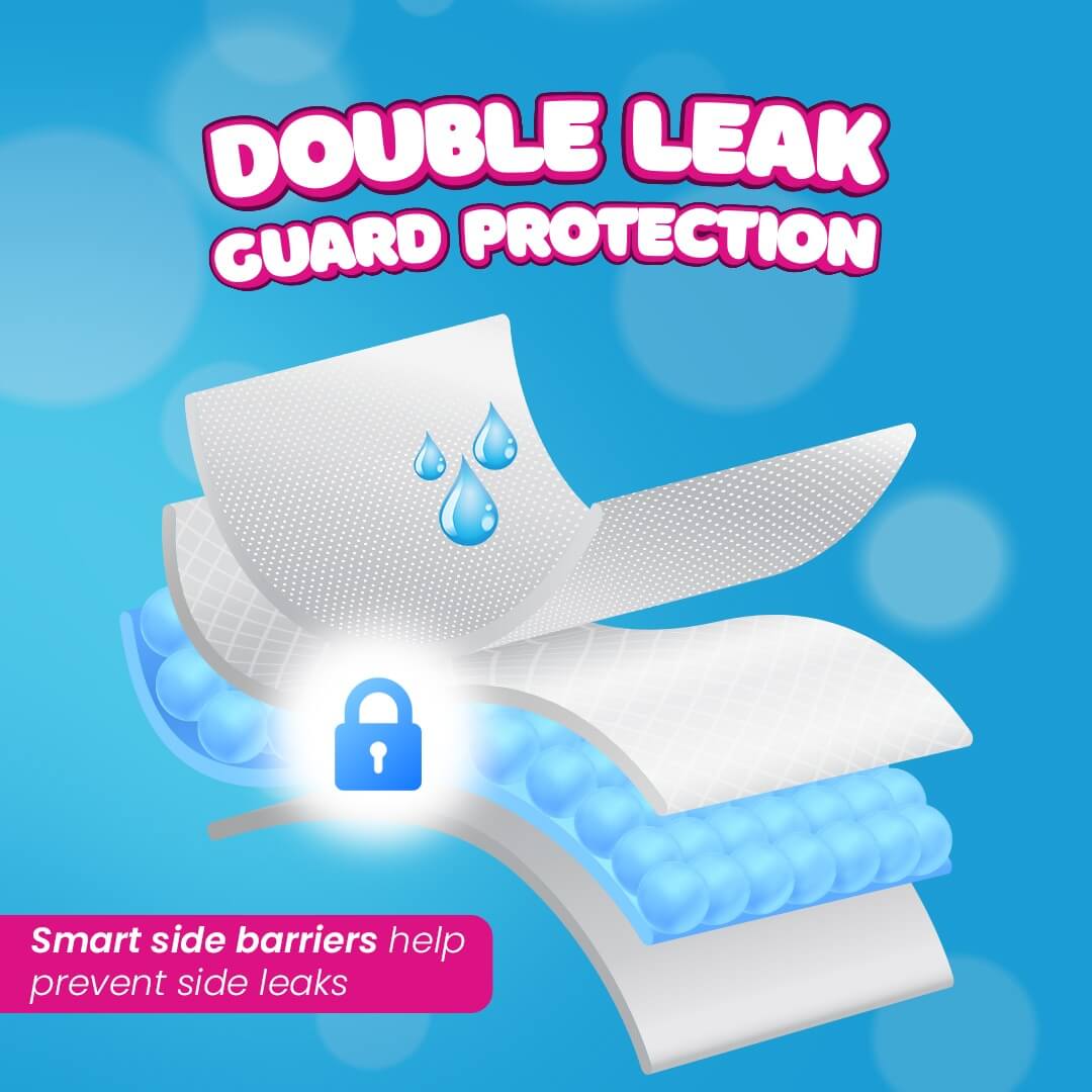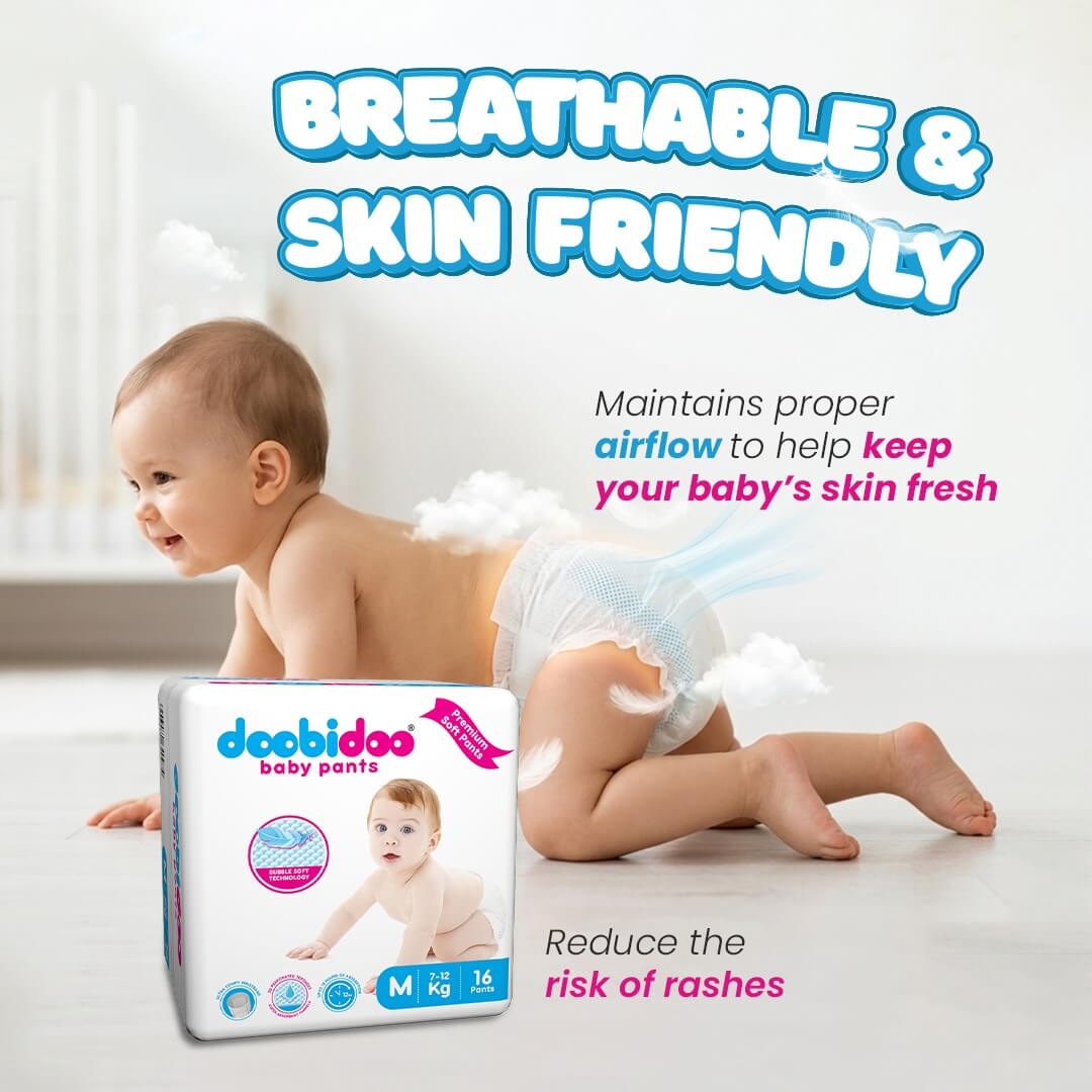 Doobidoo brings you the softest & comfiest baby diaper pants for your little one. Premium baby diapers for sensitive skin giving utmost comfort & care. It comes with a cottony soft super stretchable elastic waistband that fits around your baby’s skin which reduces friction and prevents redness around the waist. A breathable cover of diapers allows the free flow of air around the skin to keep the baby’s skin fresh and dry. Providing the bubble soft technology for ultimate comfort with a 3D perforated feather-soft top sheet which is gentle on baby’s skin and makes them feel soft and dry.
